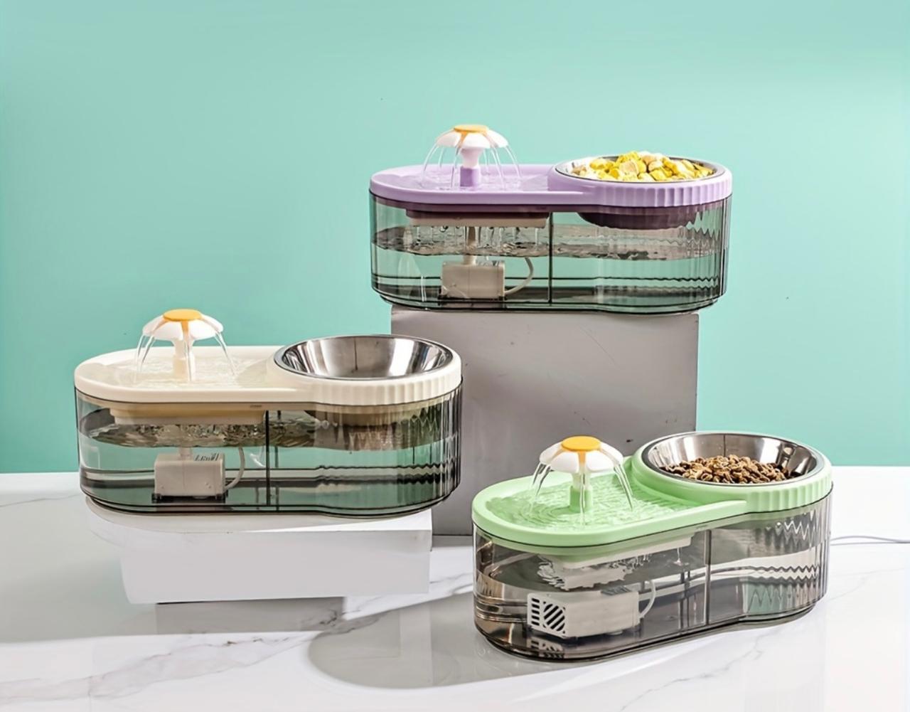 Este dispositivo está diseñado para proporcionar agua fresca y alimento a las mascotas, combinando dos funciones esenciales en un solo aparato.